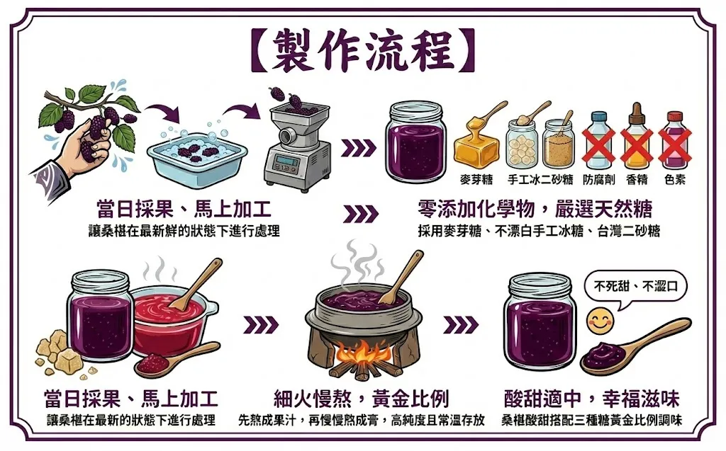 口味上,桑椹本身的酸甜,搭配三種糖的黃金比例調味,達到不死甜、不澀口的幸福滋味。