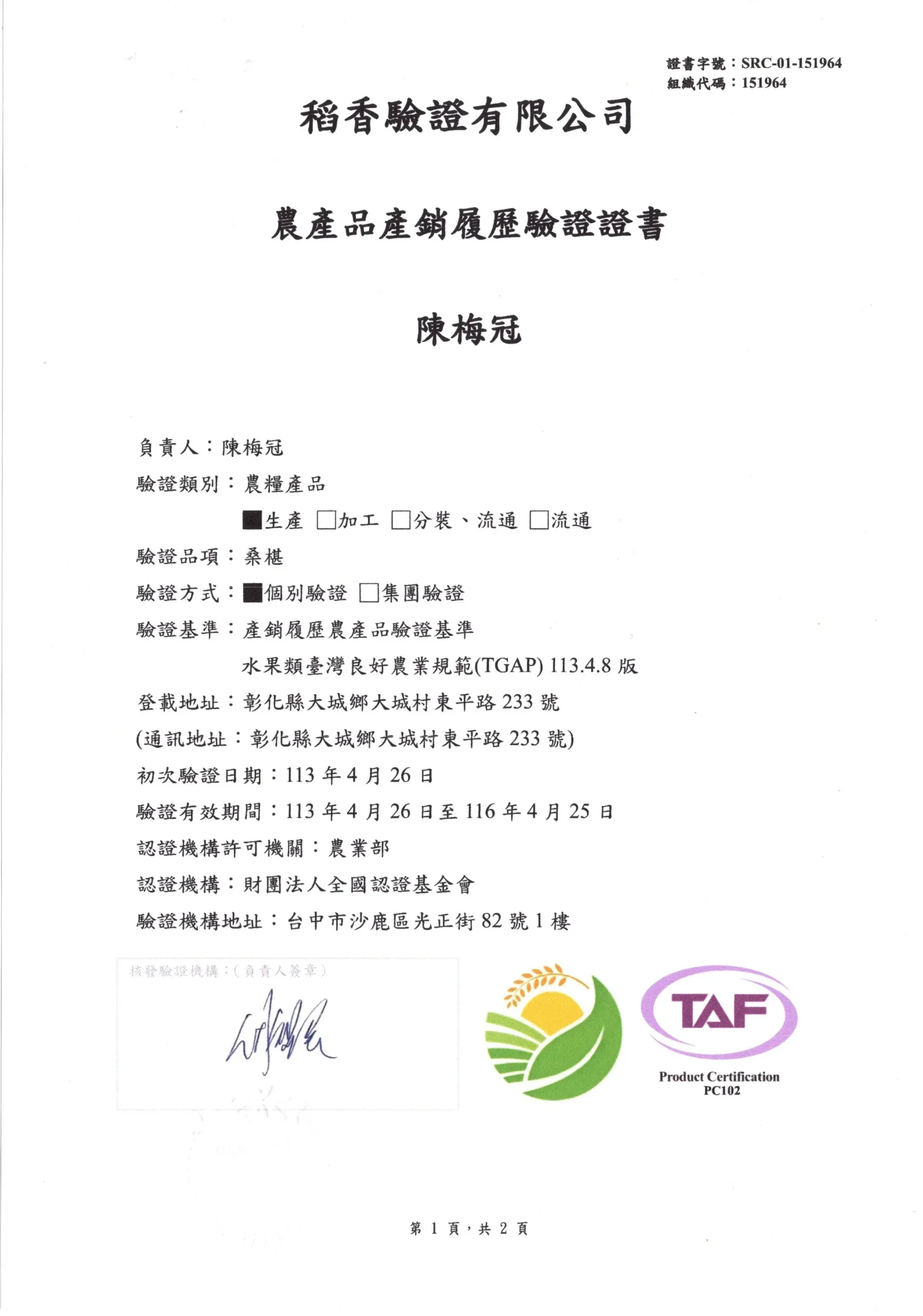 優選桑椹 Mulberry Introduction 彰化優選桑椹 天然工法,絕無使用人工添加物! 彰化在地新鮮桑椹,採用純天然日照,而非採取烤箱烘焙的方式,依照日照長短與熟成不同形成不同風味。 純手工熬煮桑椹熬果 NT$350 純手工熬煮桑椹熬膏 NT$350 桑椹熬果隨身包 NT$200 日曬手工桑椹茶葉(青綠) NT$280 日曬手工桑椹茶葉(黑金) NT$280 日曬手工桑椹茶包(青綠) NT$280 日曬手工桑椹茶包(黑金) NT$280 桑椹乾(無糖) NT$280 農產品產銷履歷驗證 貝爾國際檢測 稻香驗證產銷履歷 SGS台灣檢驗科技